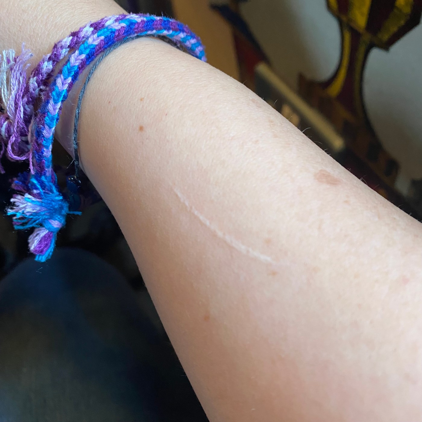 I don’t have anything particularly impressive, I’ve never had surgery, or major accident, but I’ve got a really clear scar on my forearm that I picked up a few years ago when I sliced it open on a nameplate (of all things!) at my old office.
